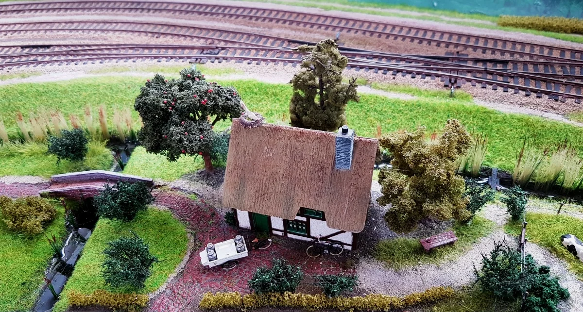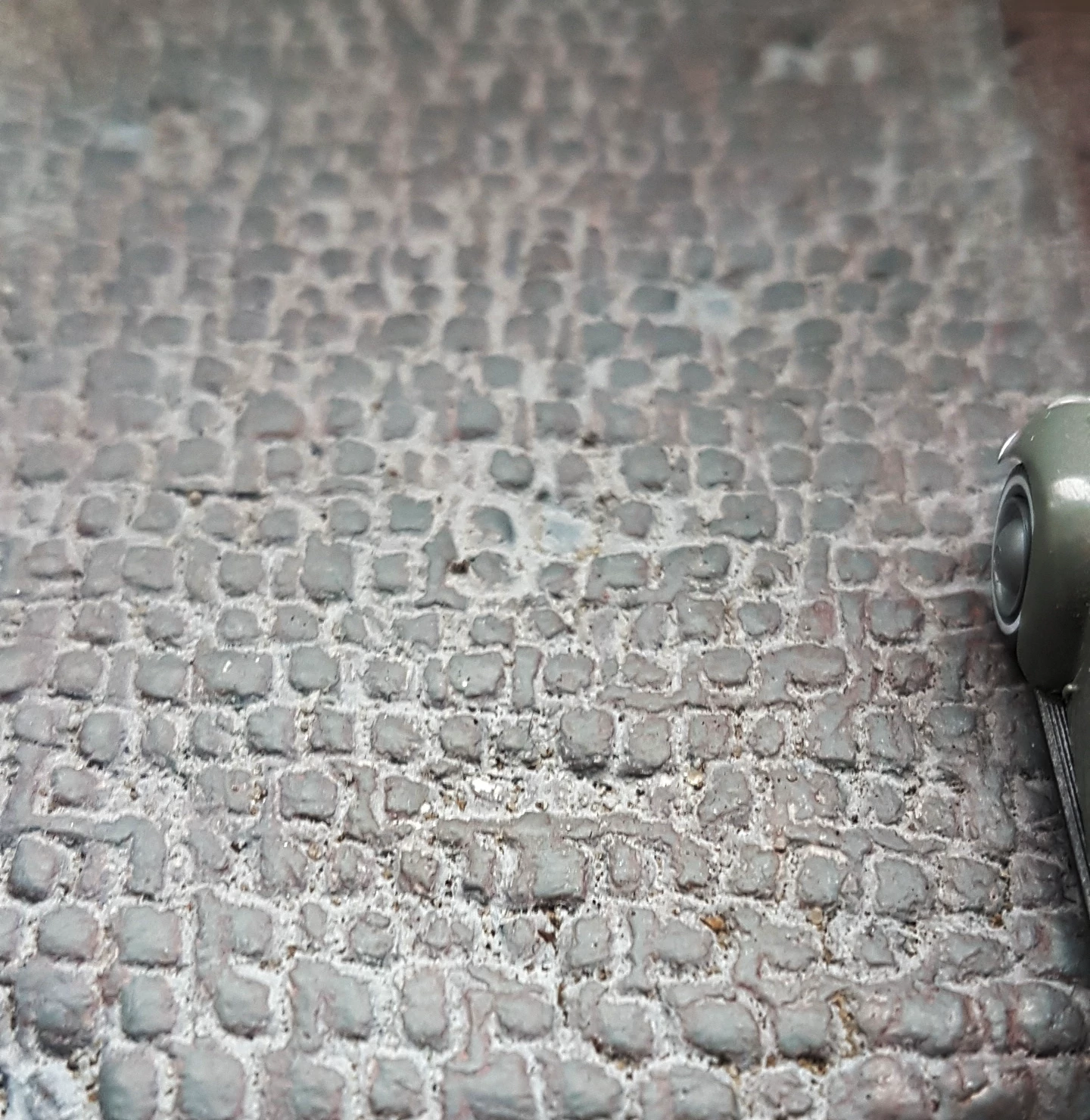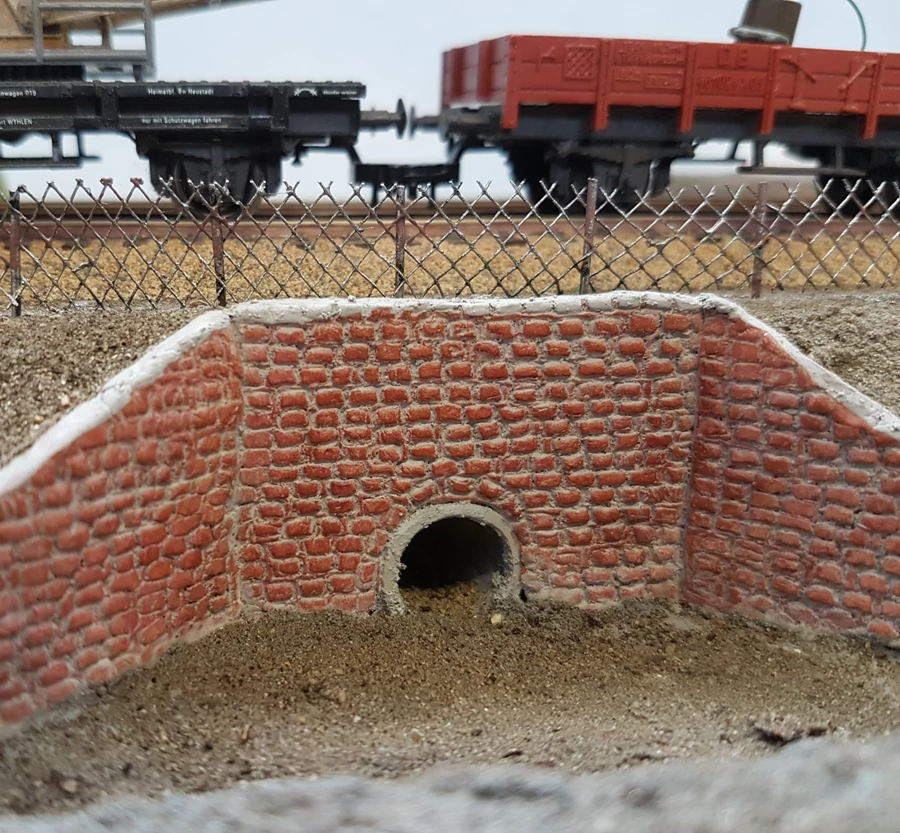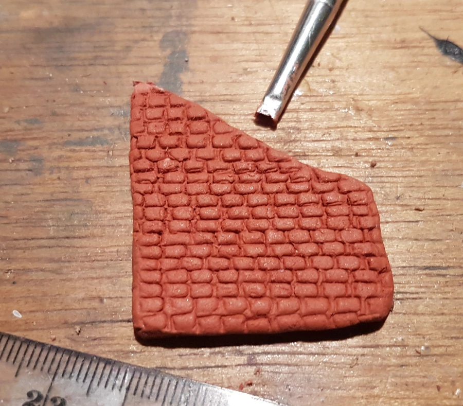 Met een penseel waar de haren van zijn verwijderd, is het uiteinde in de vorm van een baksteen gebogen. De grootte ongeveer bepalen met 1:87. Hiermee is het steentjes motief in de klei gedrukt.