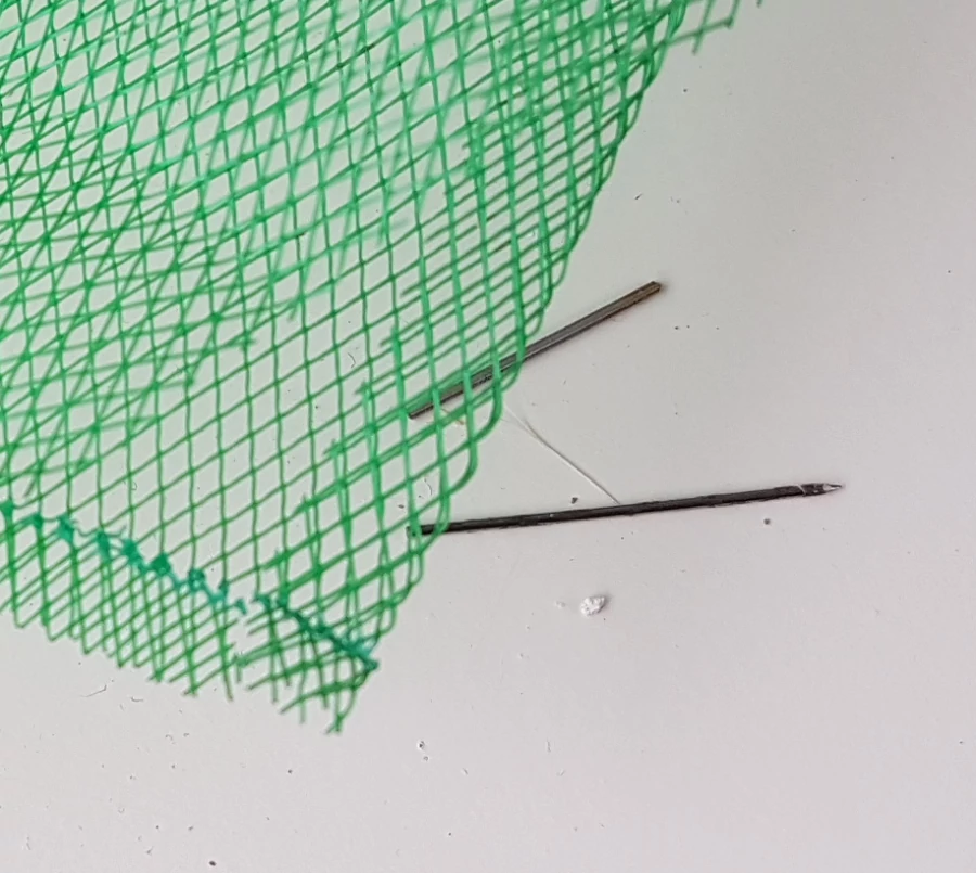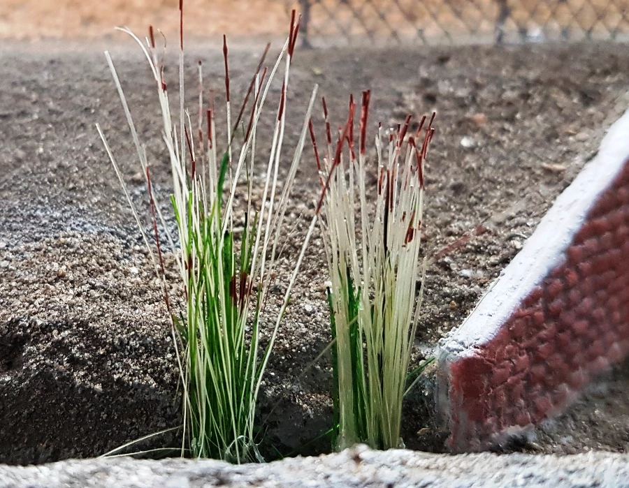 Met een druppel knutsellijm kan het "riet" op zijn plaats gezet worden. Hier zijn korte groene en wat langere in de kleur naturel gebruikt. Met een beetje bruine modelbouwverf kan er aan het uiteinde het idee van rietpluimen gegeven worden