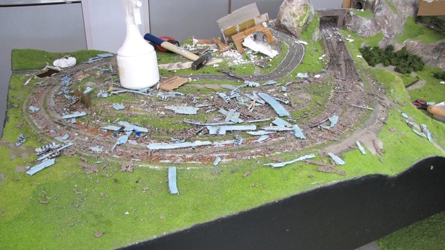 De aandacht ging hoofdzakelijk naar datgene wat op het relatief kleine stations emplacement afspeelde. Vandaar dat ik het besluit genomen heb om de oude baan af te breken en een volledig nieuwe start te maken met een plan dat aan mijn eigen verwachtingen zal voldoen. Het besluit om opnieuw te beginnen is niet zomaar even genomen, het werk van vele uren moet je zelf slopen. Ook de kosten die er in zijn gestoken zijn voor 'n deel verloren. Helemaal opnieuw beginnen en de uitdaging om weer van voor af aan te beginnen heeft uiteindelijk wel gewonnen. Je hebt deze hobby omdat je graag dingen verzint en vorm geeft. Als een baan zo goed als klaar is raak je dat kwijt. Gelukkig had ik voor het railbed boekbinders-lijm gebruikt. Flink nat maken en de zaak komt vrij makkelijk los.
