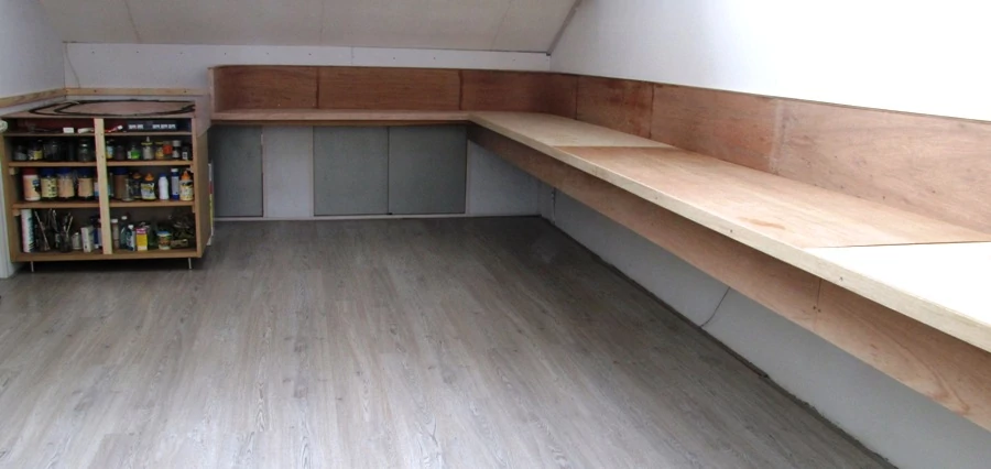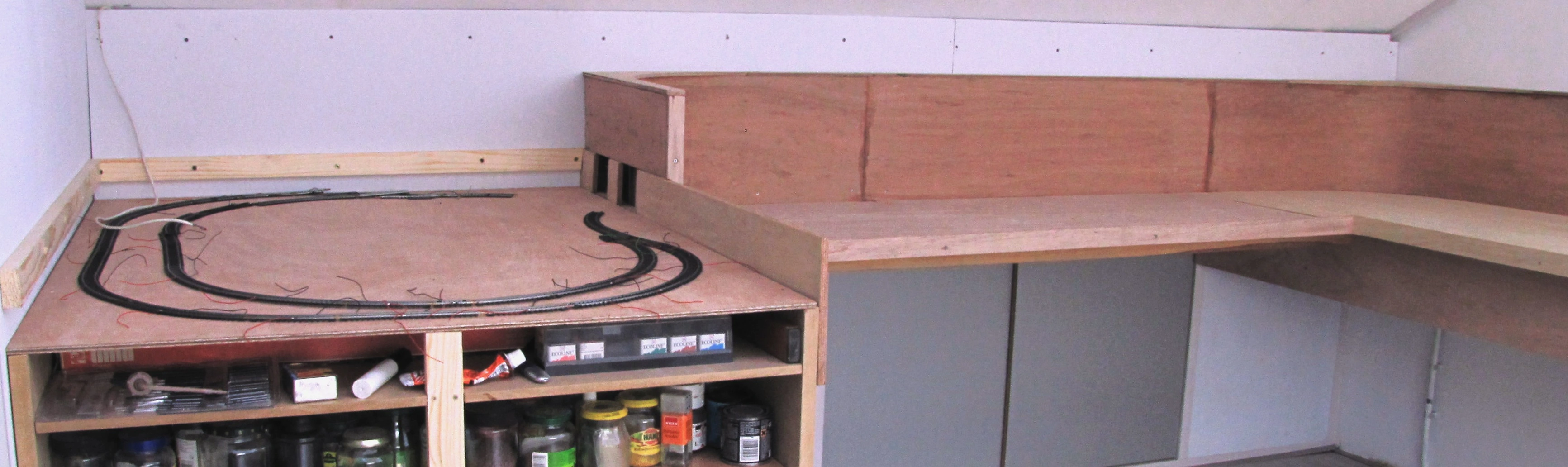 Schaduwstation Linkerzijde Eerst weer het gewenste traject uitleggen om de benodigde maat van de grondplaat te bepalen. Voor het linker schaduwstation is een kast gebouwd waarin zowel aan de voor- en achterkant veel bergruimte is voorzien. Omdat de bedrading en electronica ook boven op het blad komt geeft dat geen problemen met aansluiten. Voordat alles geschilderd wordt komt er nog een los blad bovenop, zodat ik makkelijk bij de sporen komen. Ter afwerking komen er nog twee deuren aan de voorzijde.