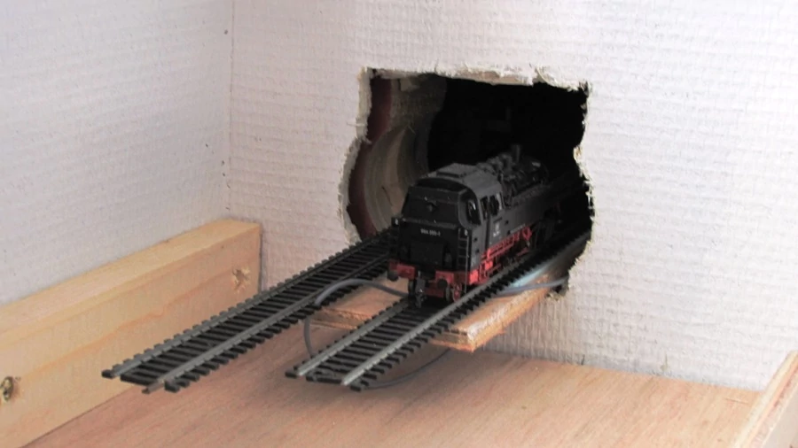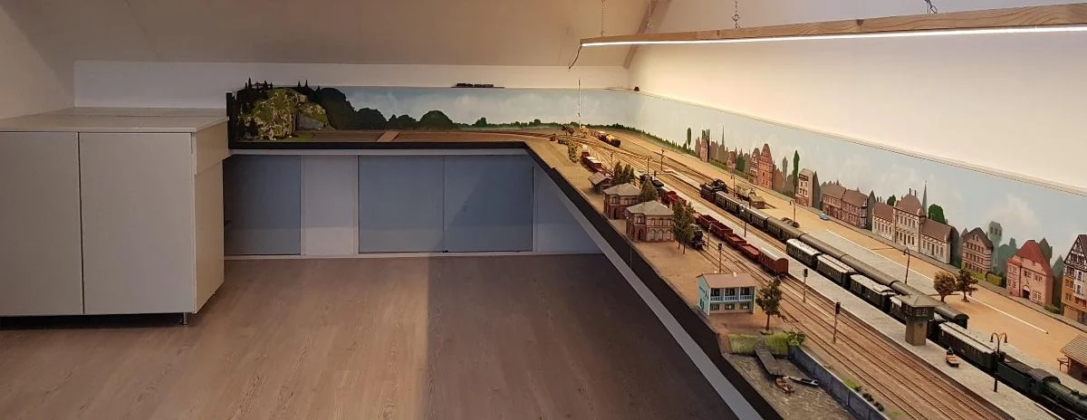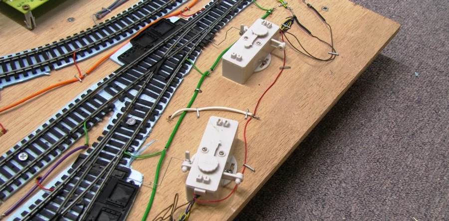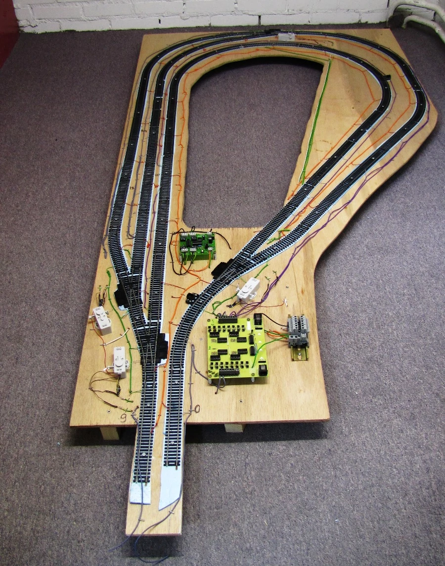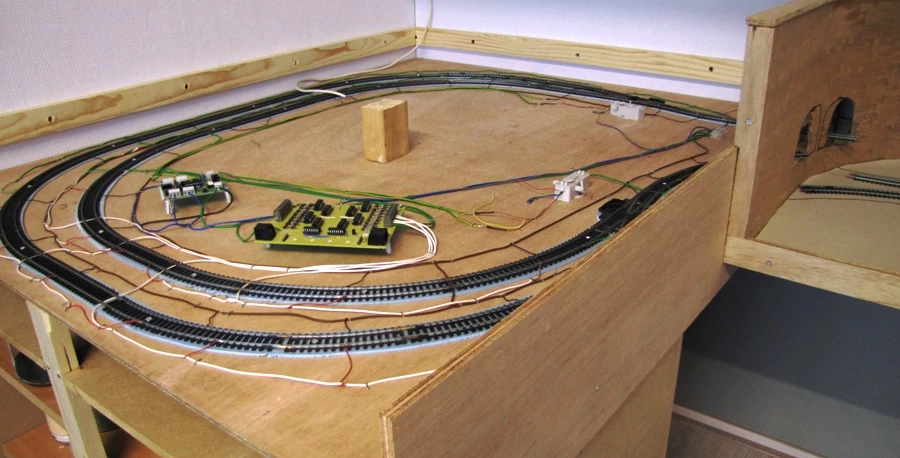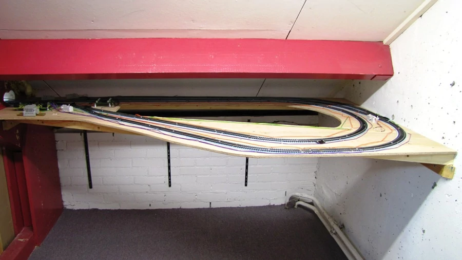 Eerst de rails uitleggen en opmeten om de benodigde grondplaat te zagen. In de planning was een dubbel inhaalspoor gepland, de ruimte laat het toe om er nog ´n spoor naast te leggen. Tegelijkertijd kan het rechter schaduwstation 4 treinen herbergen. Een extra lange en drie normale lengtes. Na het uitzagen zijn de rails (voor het geluid hier ook op de blauwe ondervloer stroken) bevestigd met schroefjes. Dit blijft zo omdat het toch uit het zicht is en de rails met schroefbevestiging makkelijk is te corrigeren. De printplaten, wisselaansturing en bedrading gewoon op de bovenzijde. Lekker makkelijk voor later onderhoud.