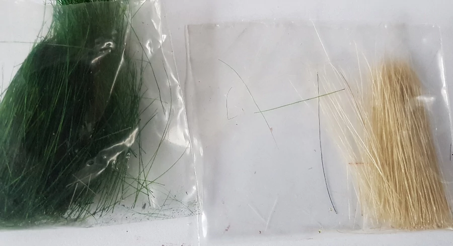 Met een druppel knutsellijm kan het "riet" op zijn plaats gezet worden. Hier zijn korte groene en wat langere in de kleur naturel gebruikt. Met een beetje bruine modelbouwverf kan er aan het uiteinde het idee van rietpluimen gegeven worden
