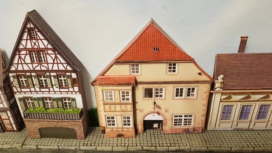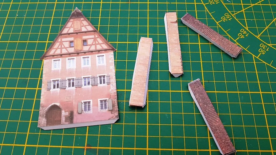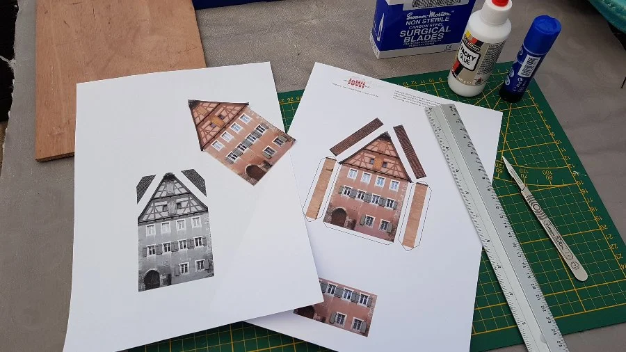 Hierin snij ik alleen de ruiten uit en plak deze als laatste achter het model om geen licht door te laten. Ook de muren en het dak voorzie ik dan van grijskarton en lijm het nu verder in model. Door het op deze wijze samen te bouwen heeft het model direct een beter uitstraling en kan je het ook voorzien van led verlichting. Per model kan je bekijken of je zelf nog wat extra's uit wil laten springen, zoals een balkon, trapopgang, uithangbord, dakranden, vensterluiken, e.d. Gewoon van dat deel een extra printje maken en met wat karton uitbouwen. Alle randen waar papier of karton te zien is met stiften of verf afwerken. Vooral voor de kozijnranden is het aan te raden om dit al te kleuren voordat de tweede print er tegen geplakt wordt.
