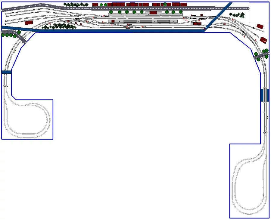Hoofdzaak moet een stations emplacement met veel rangeer mogelijkheden zijn. Het aardige is om in een programma als koploper of Rocrail de ingewikkelde treinenloop zo natuurlijk mogelijk na te spelen.
