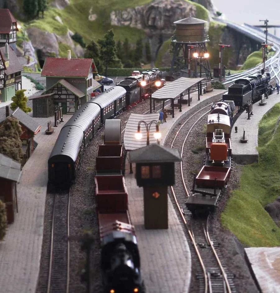 Ondanks het feit dat ik stijgings-percentages zo klein mogelijk had gehouden, moest ik toch uiteindelijk, nadat ik bij wagons verlichting had aangebracht met slepers, rekening houden met de lengte van de treinen. Locomotieven die niet in topconditie verkeerden, zorgden soms voor problemen. Het feit dat er inmiddels zeven locomotieven rond reden en ik er vaak maar twee of drie zag omdat de rest in een schaduwstation stond te wachten vond ik het ontwerp uiteindelijk minder leuk.