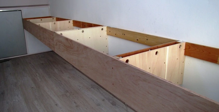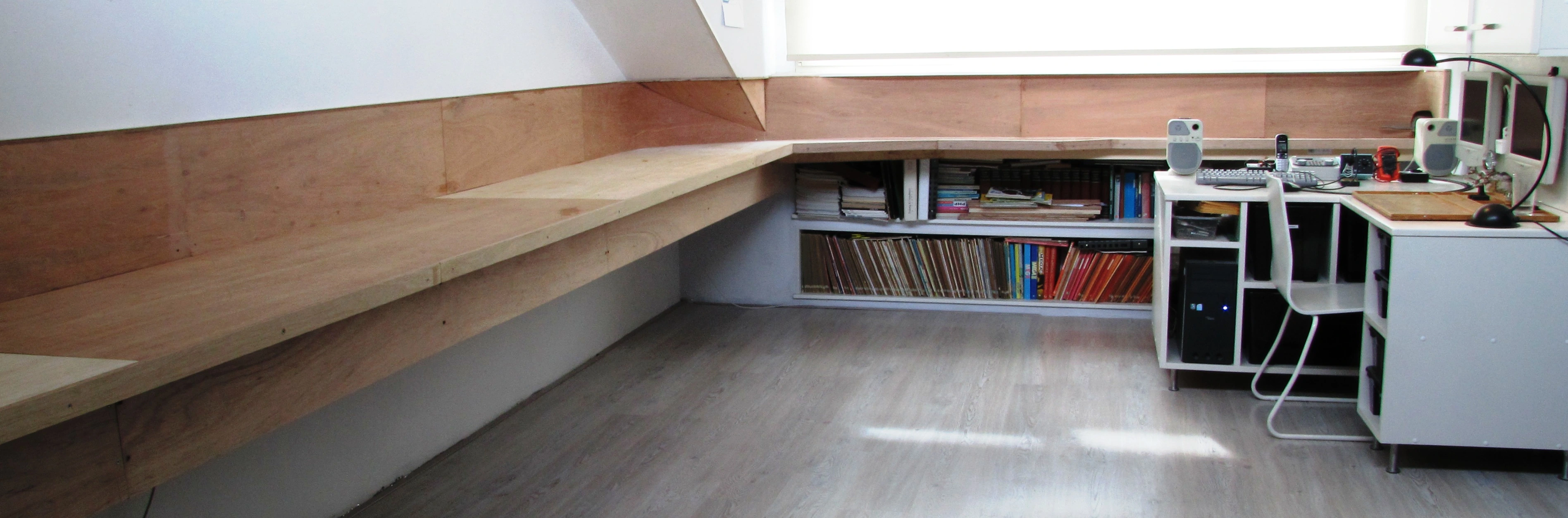Voor de bekabeling heb ik in de steunen alvast wat gaten geboord. De hoogte is zo gekozen dat ik met gestrekte rug onder de tafel kan zitten. Dit vooral met het oog op het montage werk. De steunen zijn 60 Cm diep en zullen een Multiplex plaat van 74 Cm breed en 1,2 Cm dik gaan dragen.De lengte van dit deel is 680 Cm De steunen zijn met keilbouten aan de muur bevestigd.