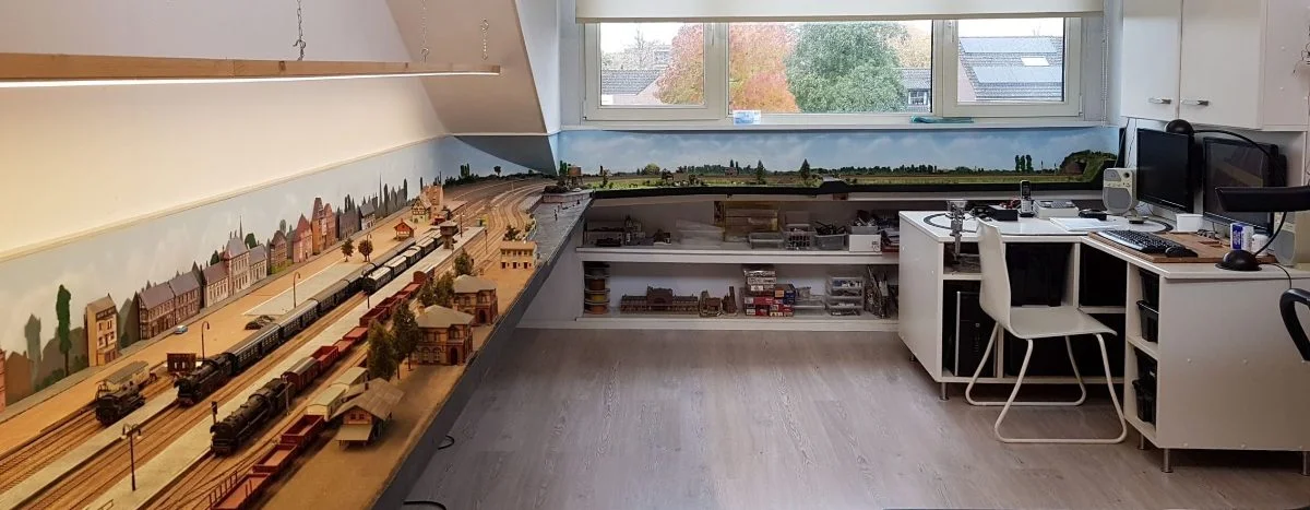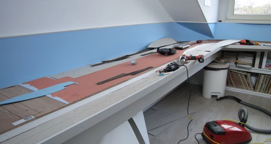 De achtergrond is beplakt met glad vliesbehang. Een rol hiervan is 10 meter. je kan dan, mits de hoogte niet meer is dan 52 Cm 10 meter naadloos plakken. Daarna het behang met latex verf blauw geschilderd. De ondergrond voor de rails is op deze foto al gedeeltelijk klaar.