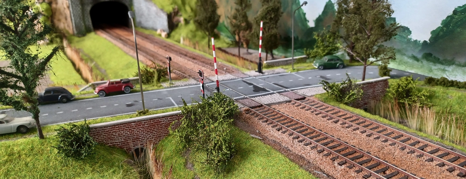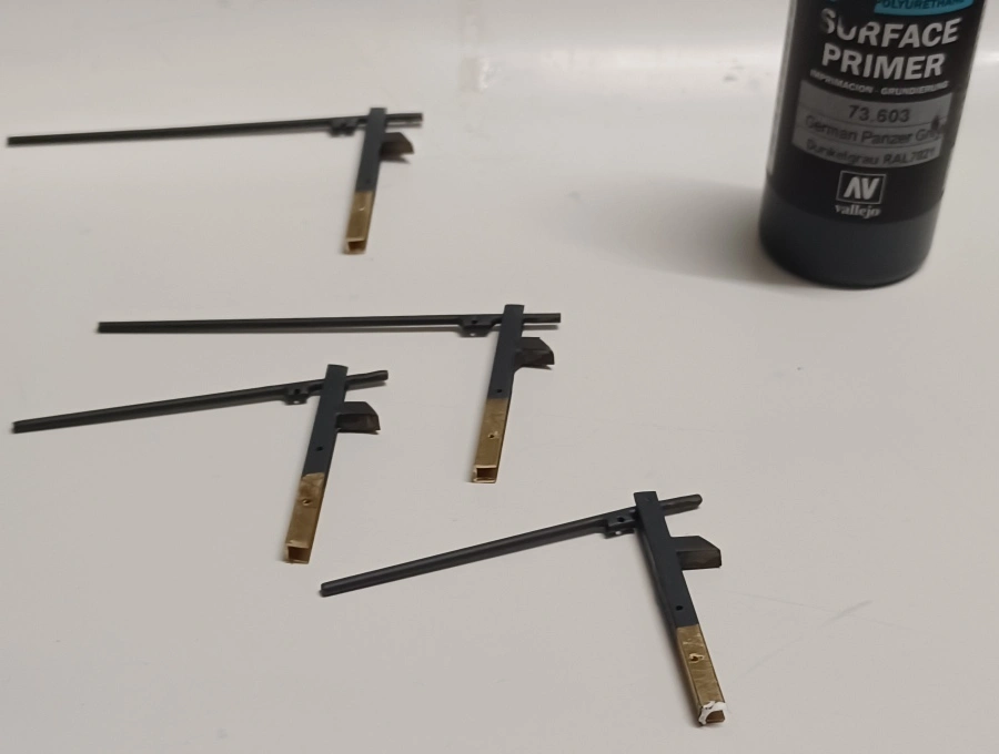 Op de eerste foto zie je de, gezaagde en geboorde, onderdelen, Deze komen van een 4x4 mm messing U profieltje, verkrijgbaar bij conrad, een 2 mm messing buisje plus wat 1 x 12 mm rondkopnageltjes allebei verkrijgbaar bij Hornbach.Verder nog benodigd: 1 mm verenstaal om met 'n servo de slagboom aan te drijven en natuurlijk wat verf.Op de foto zijn de onderdelen samen gesoldeerd, geschuurd en met de airbrush in de primer gezet.