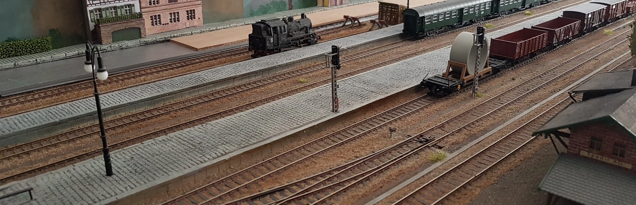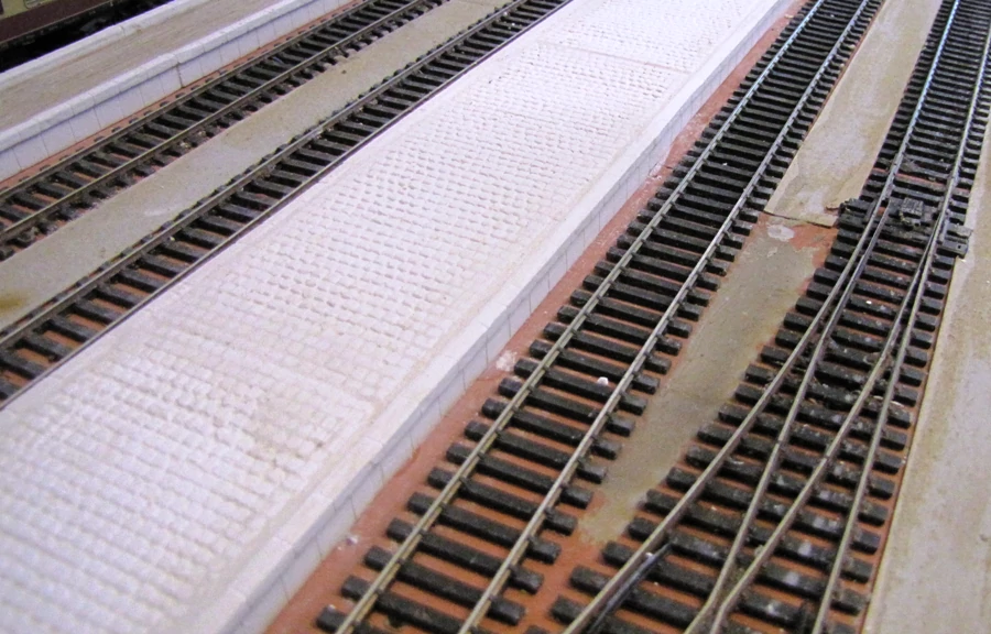 De gipsplaatjes kunnen dan op het perron geplakt worden. De naden heb ik met roodband dicht gesmeerd. Ik heb hiervoor geen modelgips gebruikt omdat dit te snel droogt en niet weggewassen kan worden. De perrons zijn daarna op de gewenste kleur gebrach en na het drogen ingewassen met een donkere kleur. Eventueel met de airbrush hier en daar wat tinten aanbrengen om de perrons oud te laten lijken.