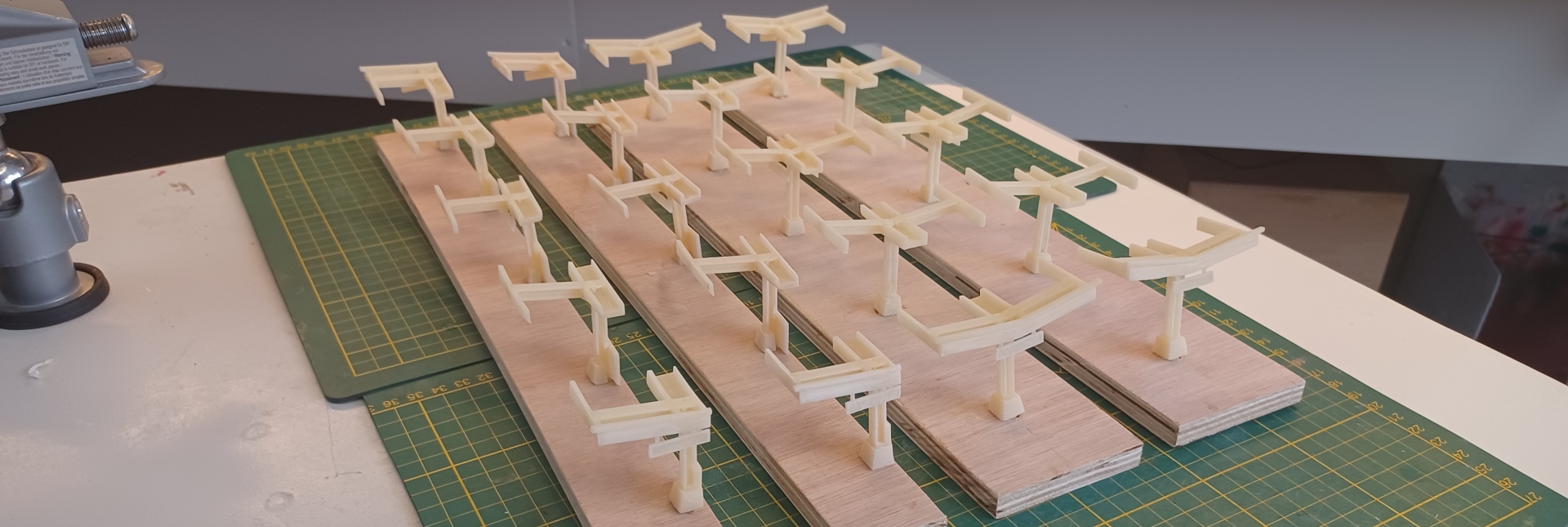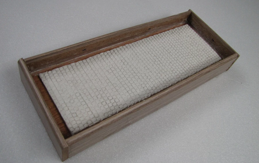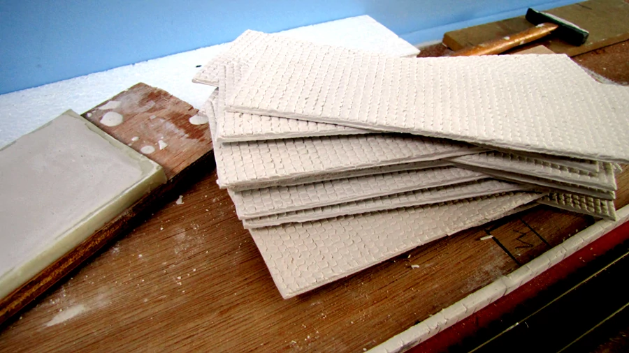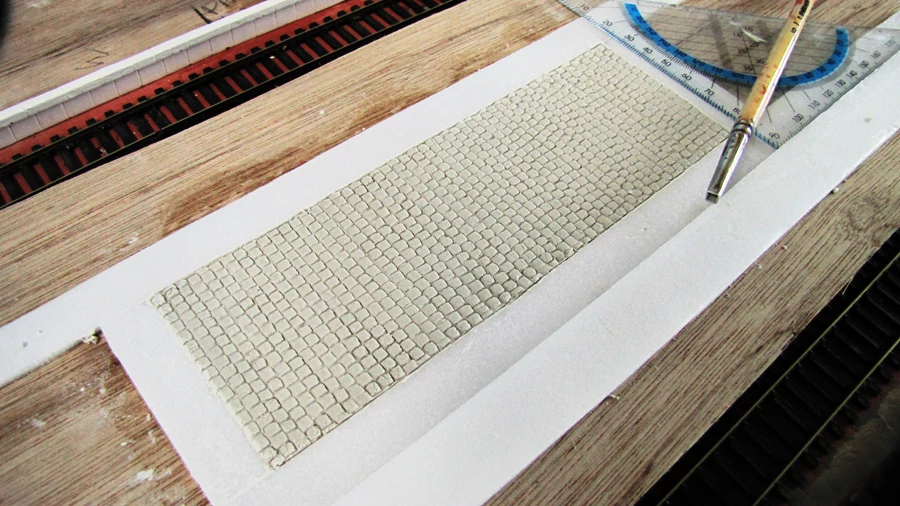 Op een plankje heb ik wat strookjes van 4 mm foam geplakt. De breedte komt overeen met de breedte tussen de perronranden. Hiertussen heb ik met behulp van een deegroller een laagje DAS klei aangebracht. Van een oude penseel heb ik de haren verwijderd en de hals met een tangetje in een vierkantje gebogen. Met wat rekenwerk kun je zelf bepalen hoe groot de tegels/stenen moeten worden. Met behulp van een teken driehoekje heb ik de tegels in de DAS klei gedrukt.